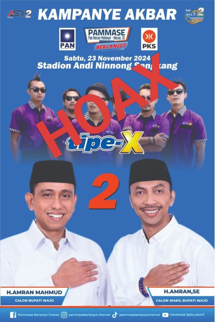 “Flyer yang menyebutkan kehadiran Tipe X di acara kami bukanlah produk resmi dari tim Pammase Berlanjut. Ini adalah tindakan pihak luar yang tidak bertanggung jawab. Kami menyesalkan penyebaran informasi yang tidak benar ini,” tegas Andi Arbina Sakti.