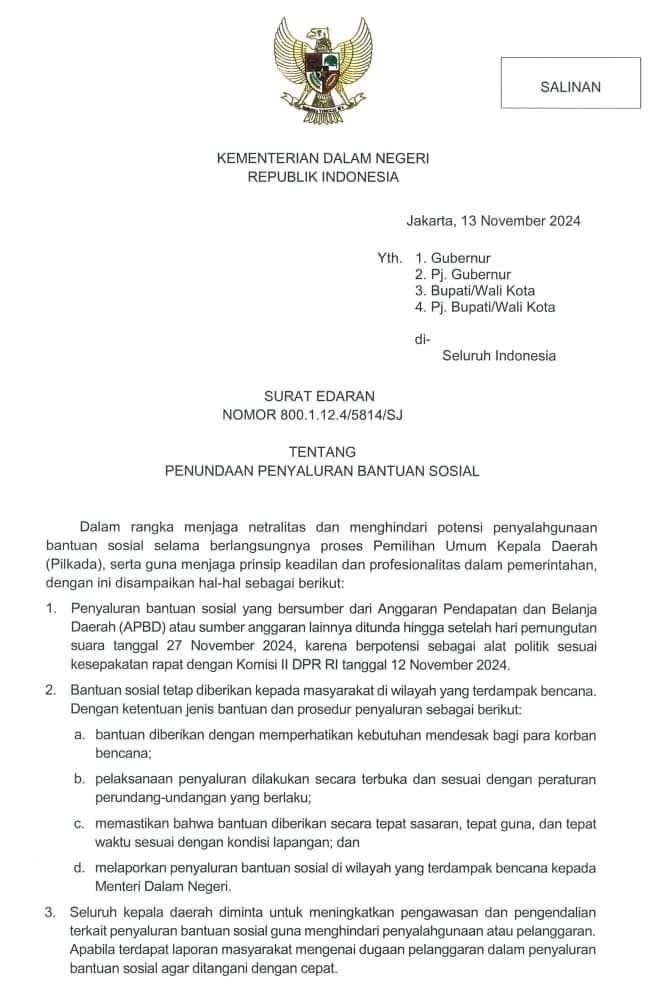Jelang 8 hari masa pencoblosan pemilihan bupati dan wakil bupati, Kementerian Dalam Negeri (Kemendagri) mengeluarkan surat edaran yang menghimbau penundaan penyaluran bantuan sosial (bansos). Surat edaran bernomor 800.1.12.4/5814/SJ ini diterbitkan pada 13 November 2024 dan ditujukan kepada gubernur, penjabat gubernur, bupati/walikota, serta penjabat bupati/walikota di seluruh Indonesia.