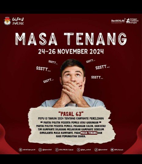 Menurut Muh. Erwin kordiv sosdiklih parmas dan SDM, KPU kabupaten Wajo, kami berharap semua calon menahan diri dimasa tenang ini, berdasarkan pasal 63 PKPU 13 tahun 2024, tentang Kampanye pemilihan, partai politik peserta pemilu, pasangan calon dari atau tim kampanye, dilarang melakukan kampanye sebelum dimulainya masa kampanye, masa tenang dan hari pemungutan suara “