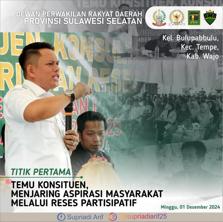 Wajo – Wakil Ketua DPRD Provinsi Sulawesi Selatan dari Partai Persatuan Pembangunan (PPP), Supriadi Arif, menggelar kegiatan reses partisipatif di Kelurahan Bulupabulu, Kecamatan Tempe, Kabupaten Wajo. Kegiatan ini bertujuan untuk menjaring aspirasi masyarakat secara langsung.