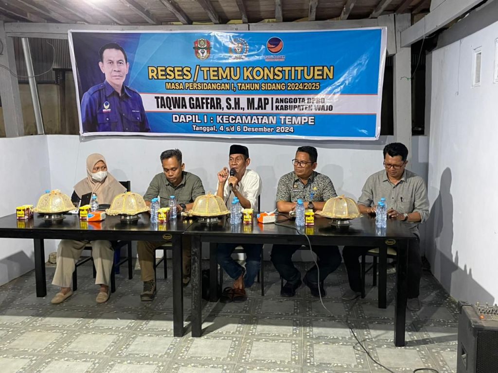 Wajo — Anggota DPRD Kabupaten Wajo dari Partai NasDem, Taqwa Gaffar, menggelar reses di Kelurahan Siengkang, Jumat, 6 Desember 2024. Dalam kegiatan tersebut, Taqwa didampingi Kepala Dinas Lingkungan Hidup (DLH), perwakilan dari Dinas Pekerjaan Umum (PU), Dinas Perumahan dan Kawasan Permukiman (Perkim), serta Lurah Siengkang.