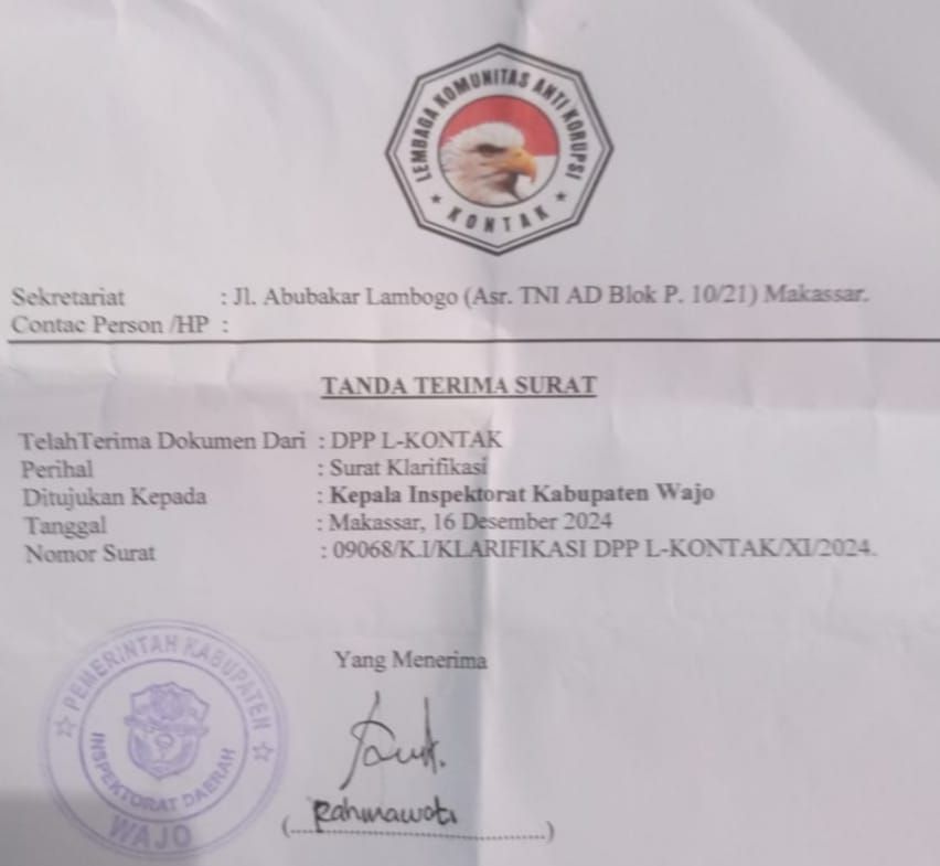 Wajo – Lembaga Komunitas Anti Korupsi (L-KONTAK) resmi melayangkan surat klarifikasi ke Inspektorat Daerah Kabupaten Wajo untuk melakukan pemeriksaan kembali terhadap penggunaan Dana Desa (DD) di Desa Pakanna dan Desa Ujunge, Kecamatan Tanasitolo, Kabupaten Wajo.