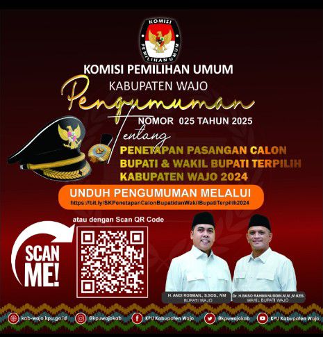 “Menetapkan pasangan Andi Rosman dan dr Baso Rahmanuddin sebagai Bupati dan Wakil Bupati Wajo terpilih dengan perolehan 130.061 suara, atau 60,9 persen dari total suara sah,” ujar Ketua KPU Wajo, Andi Rahmat Munawar, dalam pengumumannya.
