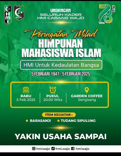Wajo, 5 Februari 2025 – Himpunan Mahasiswa Islam (HMI) Cabang Wajo menggelar perayaan hari jadi ke-78 dengan rangkaian kegiatan Barasanji dan Tudang Sipulung di Garden Coffee Sengkang. Acara yang dihadiri oleh para kader, alumni, dan tokoh penting ini berlangsung dengan khidmat dan mengusung semangat pembinaan kader melalui beberapa sambutan yang menggugah.