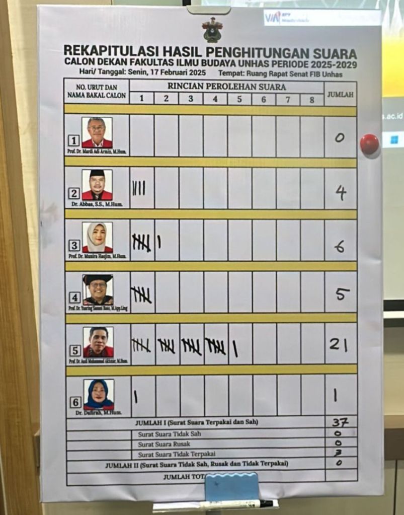 Dengan demikian tersaring nama-nama berikut dalam tahap Penyaringan Tiga Nama Calon Dekan FIB Unhas 2025-2029 yakni Prof. Dr. Andi Muhammad Akhmar, S.S., M.Hum., Prof. Dr. Munira Hasjim, S.S., M. Hum., dan Prof. Dr. Yusring Sanusi B, S.S.