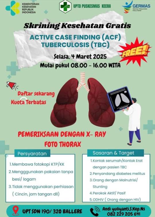 Jusriani –kader Yayasan Masyarakat Peduli Tuberkulosis (Yamali TB) di Kecamatan Keera, Kabupaten Wajo, Sulawesi Selatan– petang ini (Senin, 03/02/2025) memberitahu media ini bahwasanya skrininig TB gratis ini akan digelar di kompleks UPTD SDN 190/320 Ballere, Kecamatan Keera esok sepanjang hari (pukul 08.00 — 16.00 Wita).