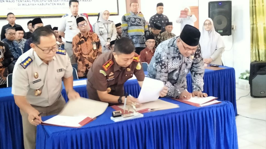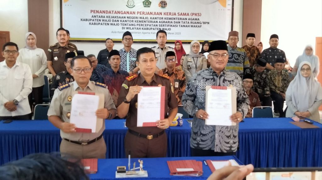 Wajo — Celoteh.Online — Upaya percepatan sertifikasi tanah wakaf di Kabupaten Wajo semakin diperkuat dengan penandatanganan Perjanjian Kerja Sama (PKS) antara Kejaksaan Negeri Wajo, Kantor Kementerian Agama Kabupaten Wajo, dan Kantor Kementerian Agraria dan Tata Ruang/BPN Kabupaten Wajo.