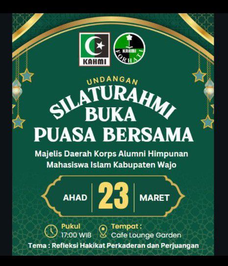 Wajo – Celoteh.Online – Majelis Daerah Korps Alumni Himpunan Mahasiswa Islam (MD-KAHMI) Kabupaten Wajo kembali menggelar silaturahmi dan buka puasa bersama dengan tema “Refleksi Hakikat Perkaderan dan Perjuangan.” Acara ini akan dilaksanakan pada Ahad, 23 Maret 2025, bertempat di Cafe Lounge Garden pukul 17.00 WITA hingga selesai.