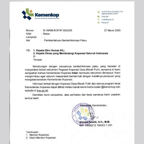 Jakarta, – Celoteh.Online – Kementerian Koperasi dan UKM menegaskan bahwa informasi mengenai rekrutmen Pegawai Koperasi Desa Merah Putih yang beredar di masyarakat adalah berita palsu atau hoaks (27/03/2025). Klarifikasi ini disampaikan melalui surat resmi yang ditandatangani oleh Sekretaris Kementerian Koperasi, Ahmad Zabadi, S.H., M.M.
