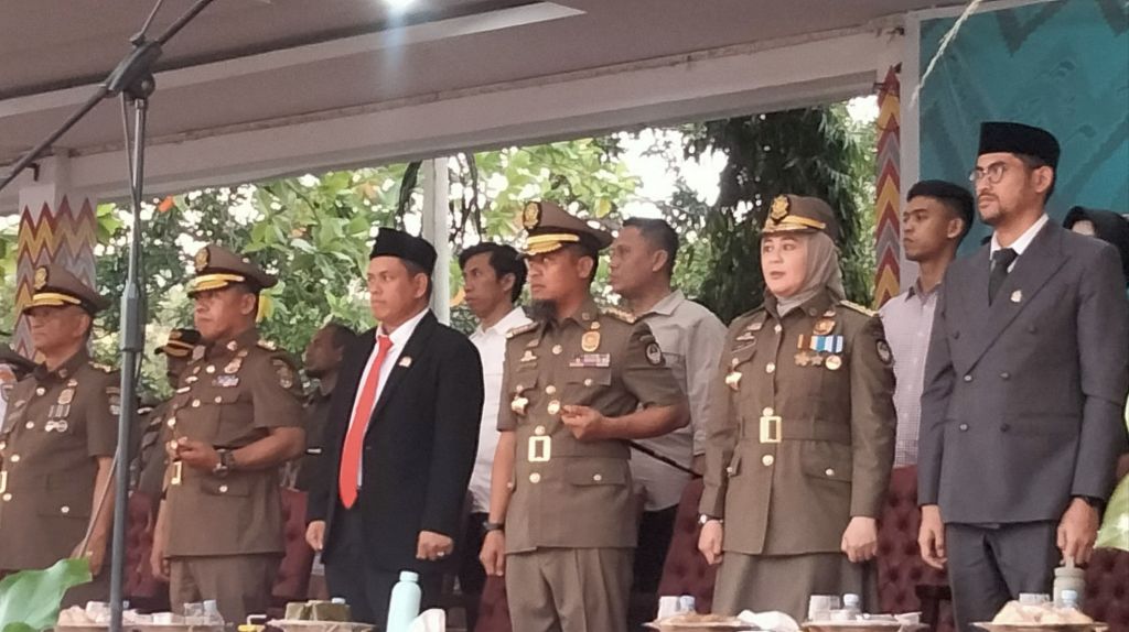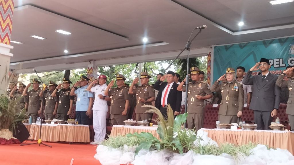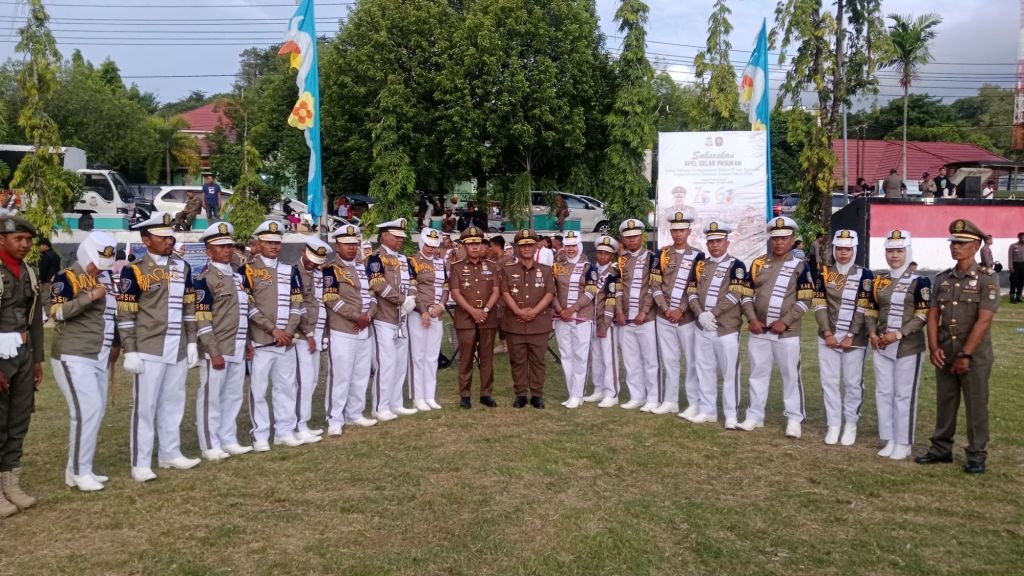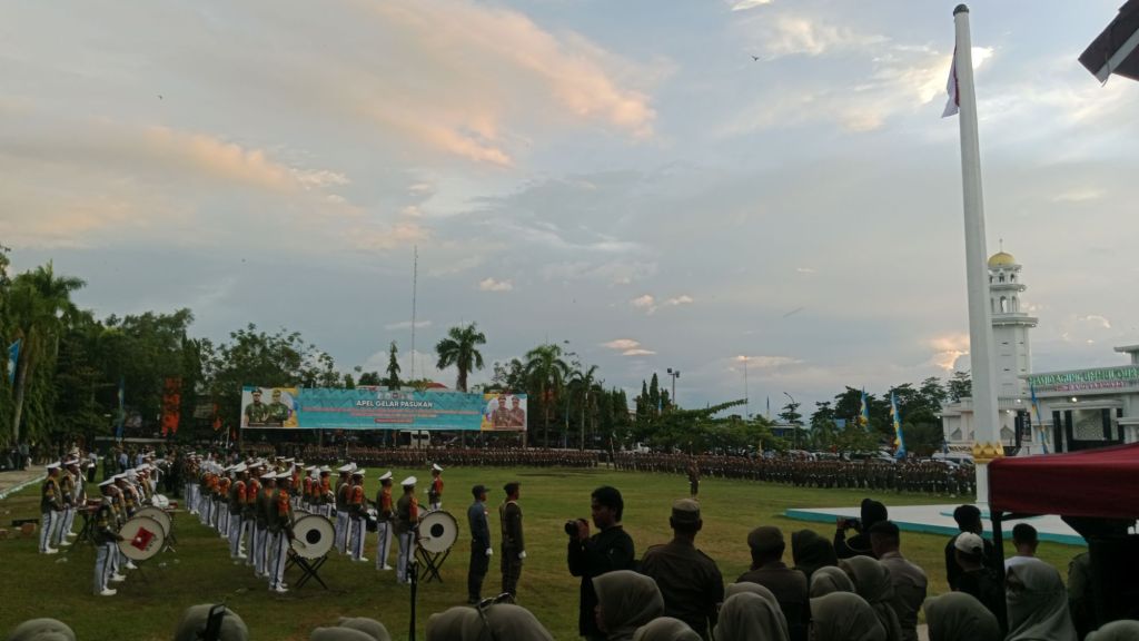 Apel gelar pasukan dengan parade pasukan Satpol PP dan Satlinmas yang menunjukkan kesiapan dan kedisiplinan tinggi dalam menjalankan tugas.