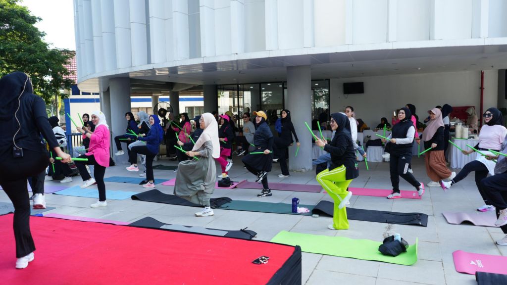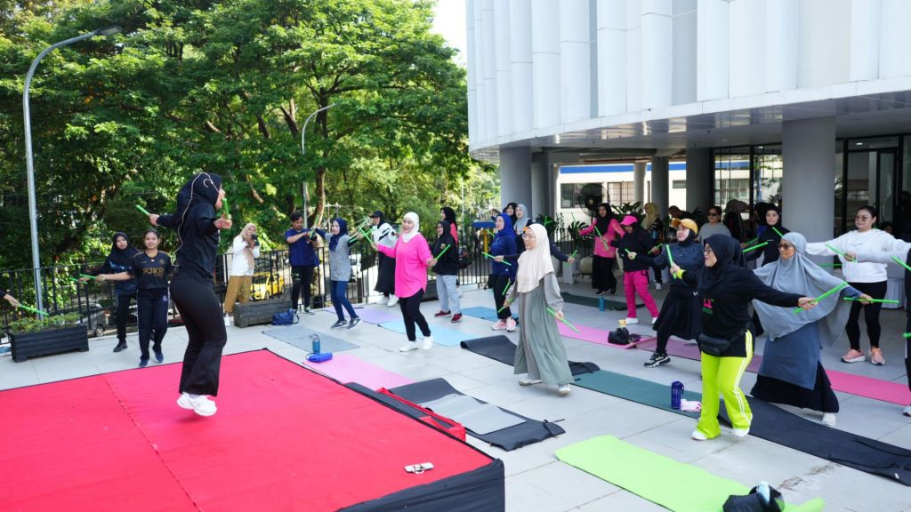 Dipandu oleh pelatih Pro Cha, para peserta menikmati gerakan dinamis pound fit yang dirancang untuk menjaga kebugaran sekaligus membangun energi positif antaranggota.