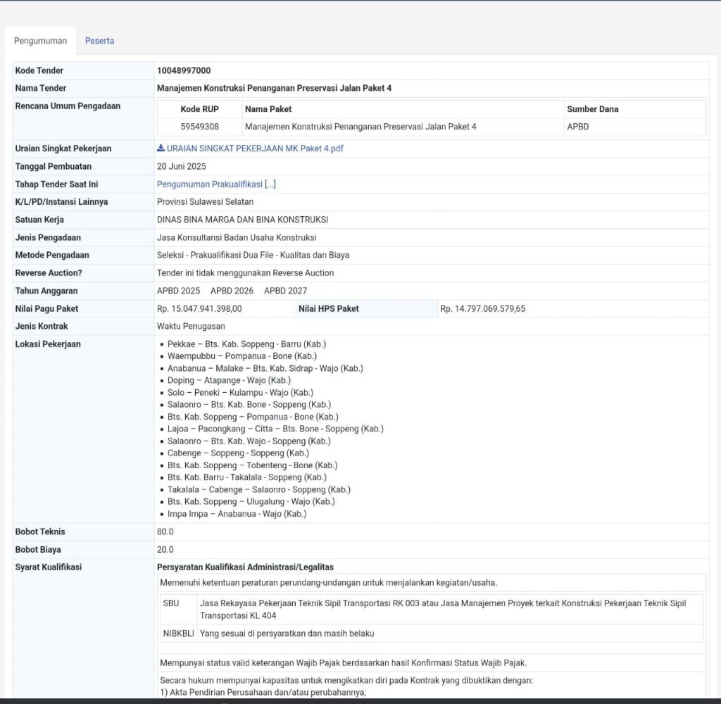 Wajo – Celoteh.Online — Kabar menggembirakan datang dari Pemerintah Provinsi Sulawesi Selatan. Tender proyek “Manajemen Konstruksi Penanganan Preservasi Jalan Paket 4” resmi diumumkan, mencakup seluruh ruas jalan provinsi yang tersebar di Kabupaten Wajo dan sekitarnya. Proyek ini menggunakan dana APBD tahun anggaran 2025 hingga 2027 dengan nilai pagu paket sebesar Rp15,047 miliar.