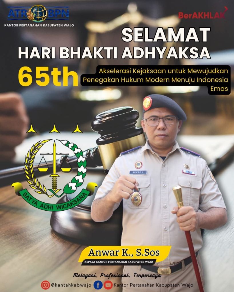 Wajo – Celoteh Online – Dalam rangka memperingati Hari Bhakti Adhyaksa ke-65 yang jatuh pada 22 Juli 2025, Kepala Kantor Pertanahan Kabupaten Wajo, Anwar K, S.Sos beserta seluruh jajaran pegawai dan staf, menyampaikan ucapan selamat dan apresiasi yang setinggi-tingginya kepada seluruh insan Adhyaksa di seluruh Indonesia, khususnya di Kabupaten Wajo.