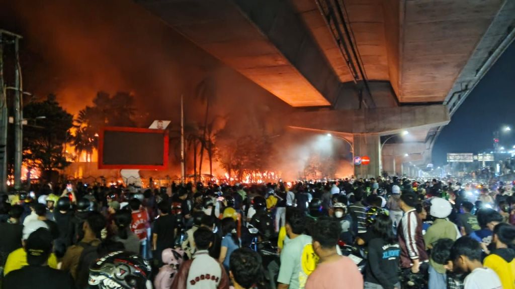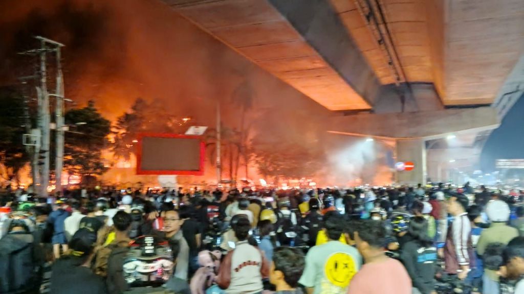Kobaran api terus membesar tanpa penanganan, sementara asap hitam pekat menutup pandangan di kawasan sekitar. Puluhan kendaraan dinas maupun milik warga hangus terbakar dan sebagian dirusak. Jalan di sekitar kantor DPRD lumpuh total akibat massa yang memblokade akses utama.