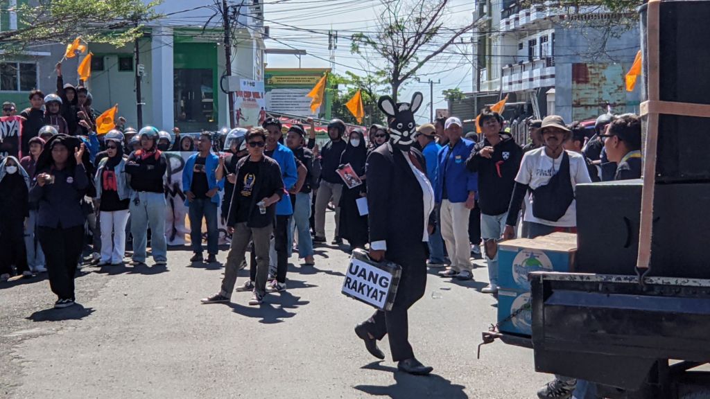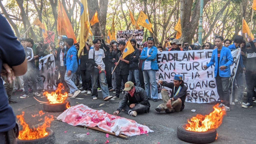 Mereka membawa keranda, menaburkan bunga, hingga membacakan doa Yasin sebagai simbol “matinya hati nurani wakil rakyat”.