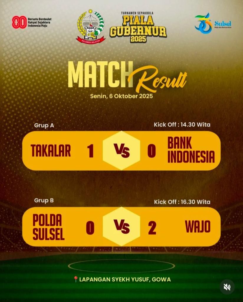 GOWA — Tim sepak bola Kabupaten Wajo meraih kemenangan meyakinkan 2-0 atas tim Polda Sulsel pada laga Grup B Turnamen Sepak Bola Piala Gubernur Sulawesi Selatan 2025 yang digelar di Lapangan Syekh Yusuf, Gowa, Senin (6/10/2025).
