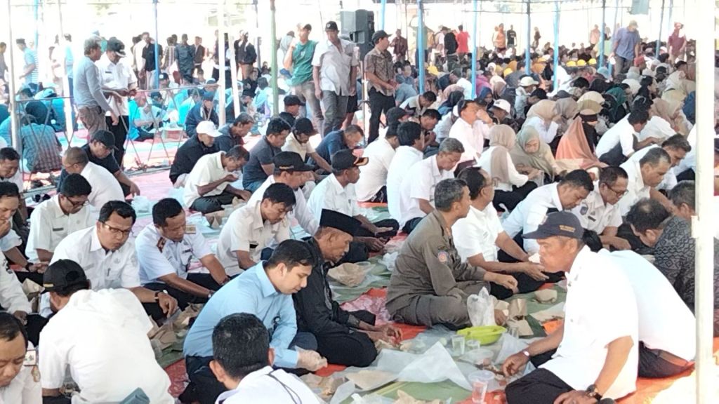 Suasana kebersamaan tampak saat seluruh peserta, termasuk para pejabat, makan bersama beralaskan daun pisang tanpa pembatas antara petani dan tamu undangan lainnya.
