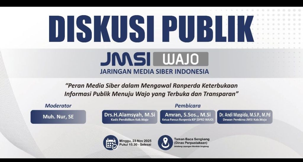 Wajo — Celoteh.Online – Jaringan Media Siber Indonesia (JMSI) Wajo menggelar diskusi publik bertema “Peran Media Siber dalam Mengawal Ranperda Keterbukaan Informasi Publik Menuju Wajo yang Terbuka dan Transparan” di Taman Baca Sengkang, Dinas Perpustakaan Wajo, Minggu (23/11/2025).