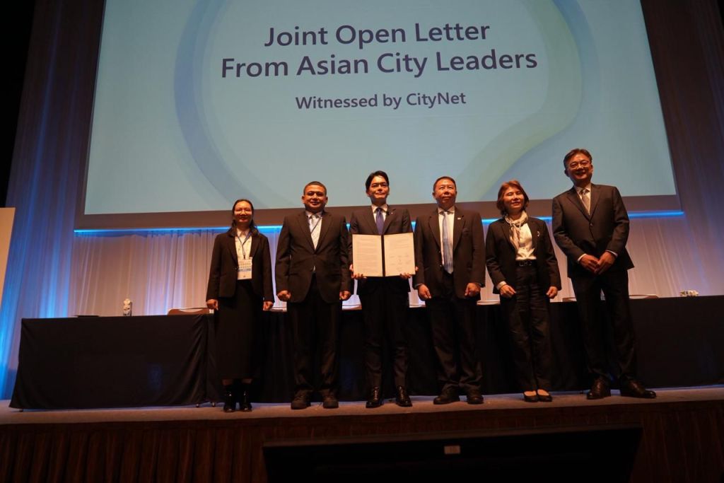 Para wali kota dan pemimpin kota Asia melakukan penandatanganan publik (public signing) sebagai bentuk komitmen menuju ekonomi sirkular, netral karbon, dan pembangunan kota berkelanjutan.