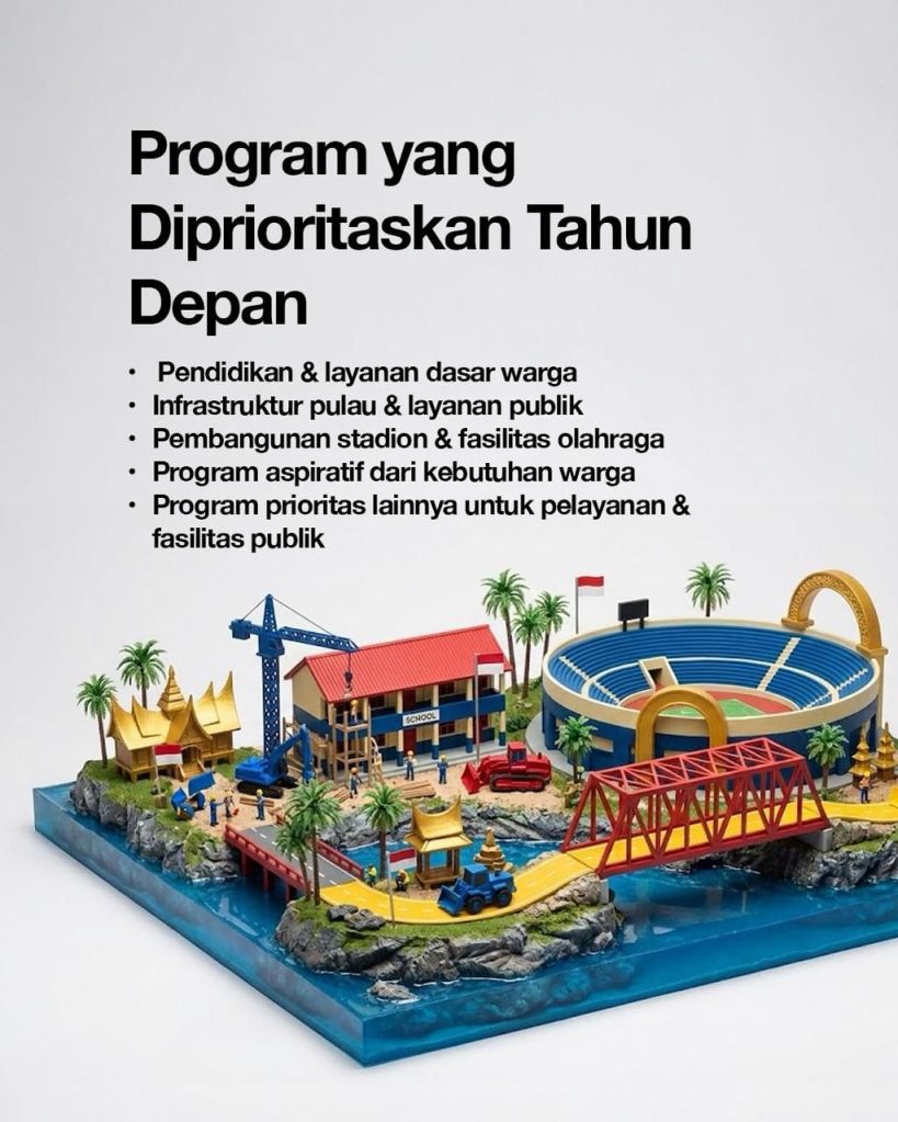 Fokus pembangunan tahun 2026 mencakup sektor pendidikan, kesehatan, infrastruktur wilayah daratan dan kepulauan, hingga keberlanjutan pembangunan Stadion.
