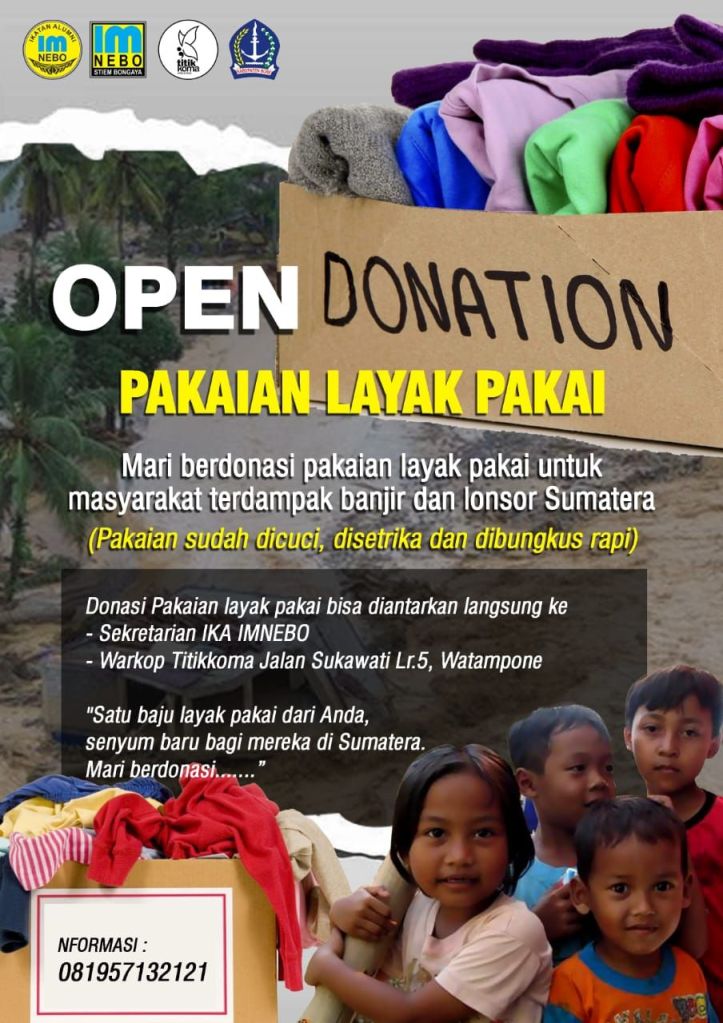 Aksi kemanusiaan ini diprakarsai oleh alumni IMNEBO dan didukung oleh Titikkoma Coffee & Friends yang ditetapkan sebagai pusat titik pengumpulan donasi. Bantuan pakaian layak pakai yang terkumpul akan dikemas dan didistribusikan langsung kepada warga terdampak di wilayah bencana.