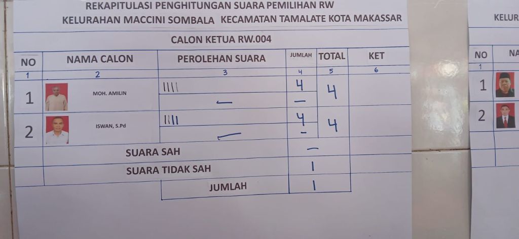 Makassar, Celoteh.Online – Pemilihan Ketua RW 004 di Kelurahan Maccini Sombala, Kecamatan Tamalate, Kota Makassar berlangsung tegang setelah dua kandidat, Mohammad Amilin dan Iswan, memperoleh jumlah suara yang sama. Keduanya mendapatkan 4 suara dari para Ketua RT yang memiliki hak pilih.