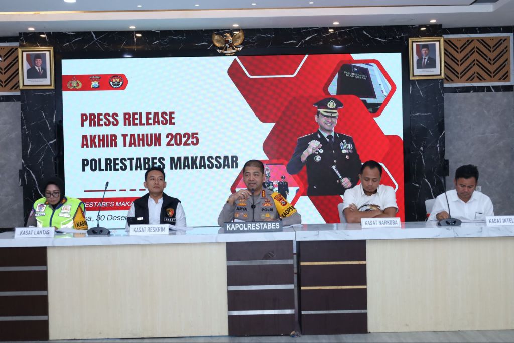 Kapolrestabes Makassar, Kombes Pol. Arya Perdana, S.H., S.I.K., M.Si., memaparkan evaluasi kinerja kepolisian selama periode Januari hingga Desember 2025 dalam konferensi pers akhir tahun. Data resmi menunjukkan sepanjang 2025 tercatat 5.421 gangguan kamtibmas, menurun dibandingkan tahun 2024 yang mencapai 6.038 kasus. Penurunan terjadi pada tindak pidana konvensional seperti pencurian dengan pemberatan, pencurian kendaraan bermotor, dan penganiayaan.