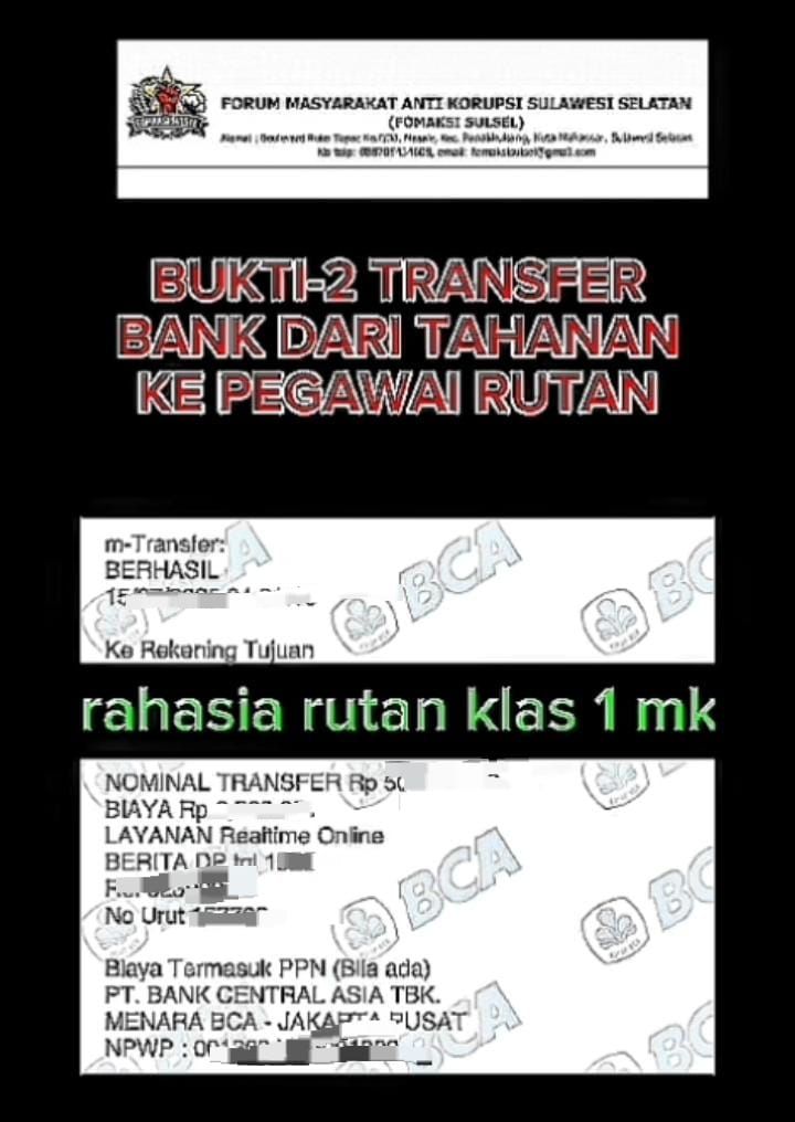 Dalam laporan FOMAKSI Sulsel, disebutkan adanya dugaan transaksi uang yang melibatkan seorang tahanan atas nama Ambo Ulang, yang diduga membayar Rp8 juta kepada salah satu pegawai rutan. Uang tersebut disebut-sebut diperuntukkan bagi oknum pimpinan rutan agar tahanan tersebut dapat turun ke blok tertentu di lingkungan Rutan Kelas I Makassar.