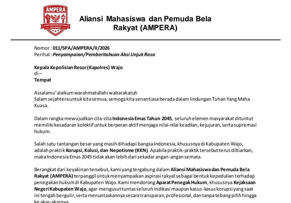 Melalui pemberitahuan tersebut, AMPERA berharap pihak Polres Wajo dapat melakukan pengamanan agar pelaksanaan aksi berjalan aman, tertib, dan kondusif.