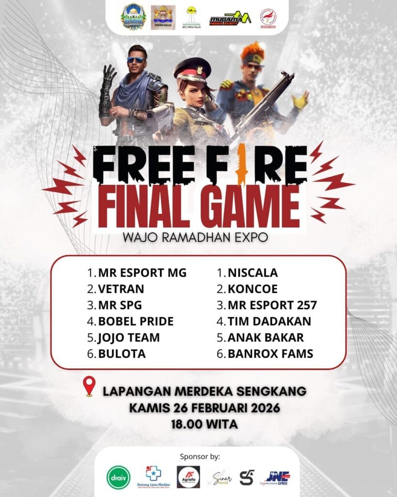 WAJO — CELOTEH.ONLINE – Partai final turnamen Free Fire dalam rangkaian Wajo Ramadhan Expo (WARE) 2026 digelar malam ini, Kamis (26/2/2026), di Lapangan Merdeka Sengkang mulai pukul 18.00 WITA. Sebanyak 12 tim akan bertarung memperebutkan gelar juara pada laga puncak tersebut.
