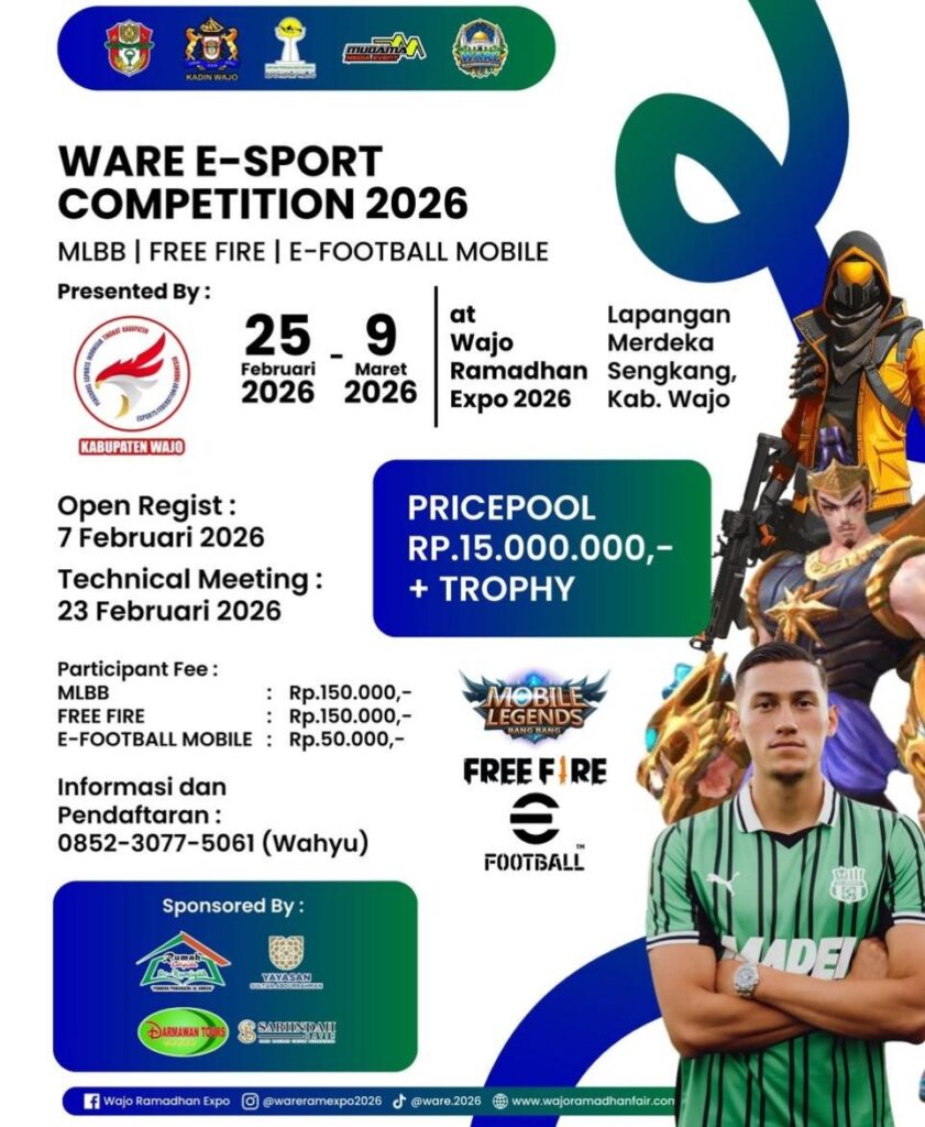 WAJO – CELOTEH.ONLINE – Pecinta E-Sport di Kabupaten Wajo akan disuguhkan pertandingan gim Free Fire pada ajang Wajo Ramadhan Expo 2026 (WARE) yang digelar besok. Laga ini menjadi bagian dari rangkaian kompetisi E-Sport yang resmi dipertandingkan dalam event tahunan tersebut.