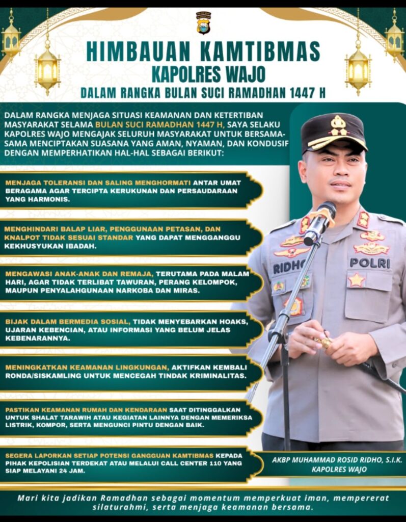 WAJO – CELOTEH.ONLINE – Kapolres Wajo, AKBP Muhammad Rosid Ridho, S.I.K., mengeluarkan himbauan kamtibmas kepada masyarakat dalam rangka menjaga situasi keamanan dan ketertiban selama Bulan Suci Ramadhan 1447 Hijriah.