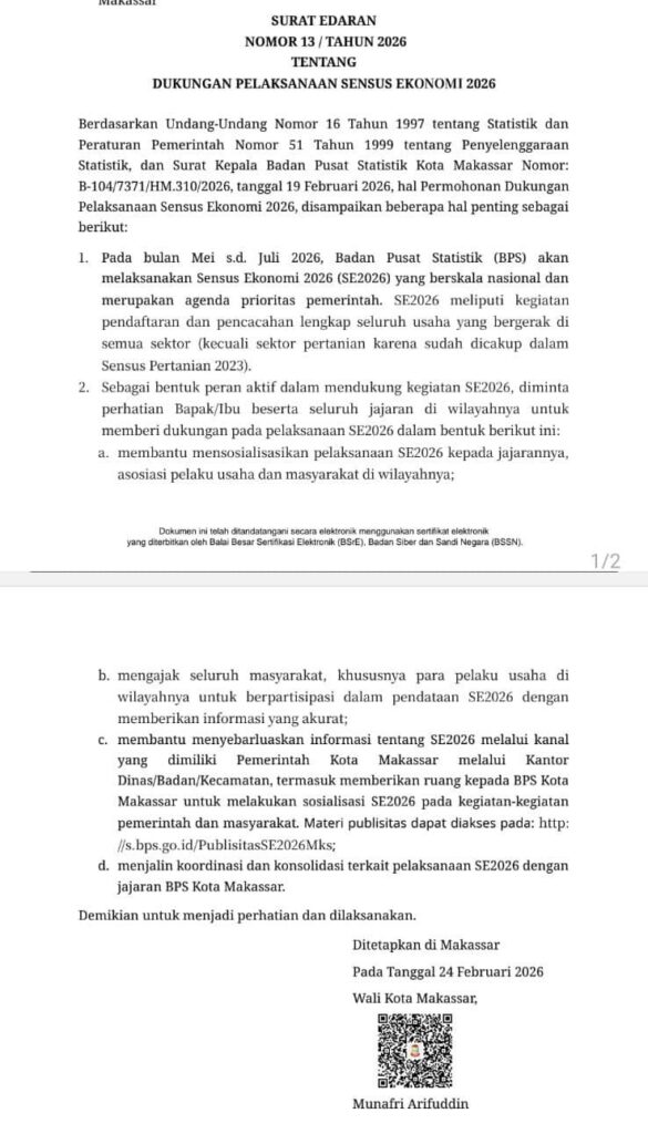 Dalam surat edaran dikeluarkan Wali Kota Makassar, tersebut dijelaskan bahwa pada bulan Mei hingga Juli 2026, BPS akan melaksanakan Sensus Ekonomi 2026 secara nasional.